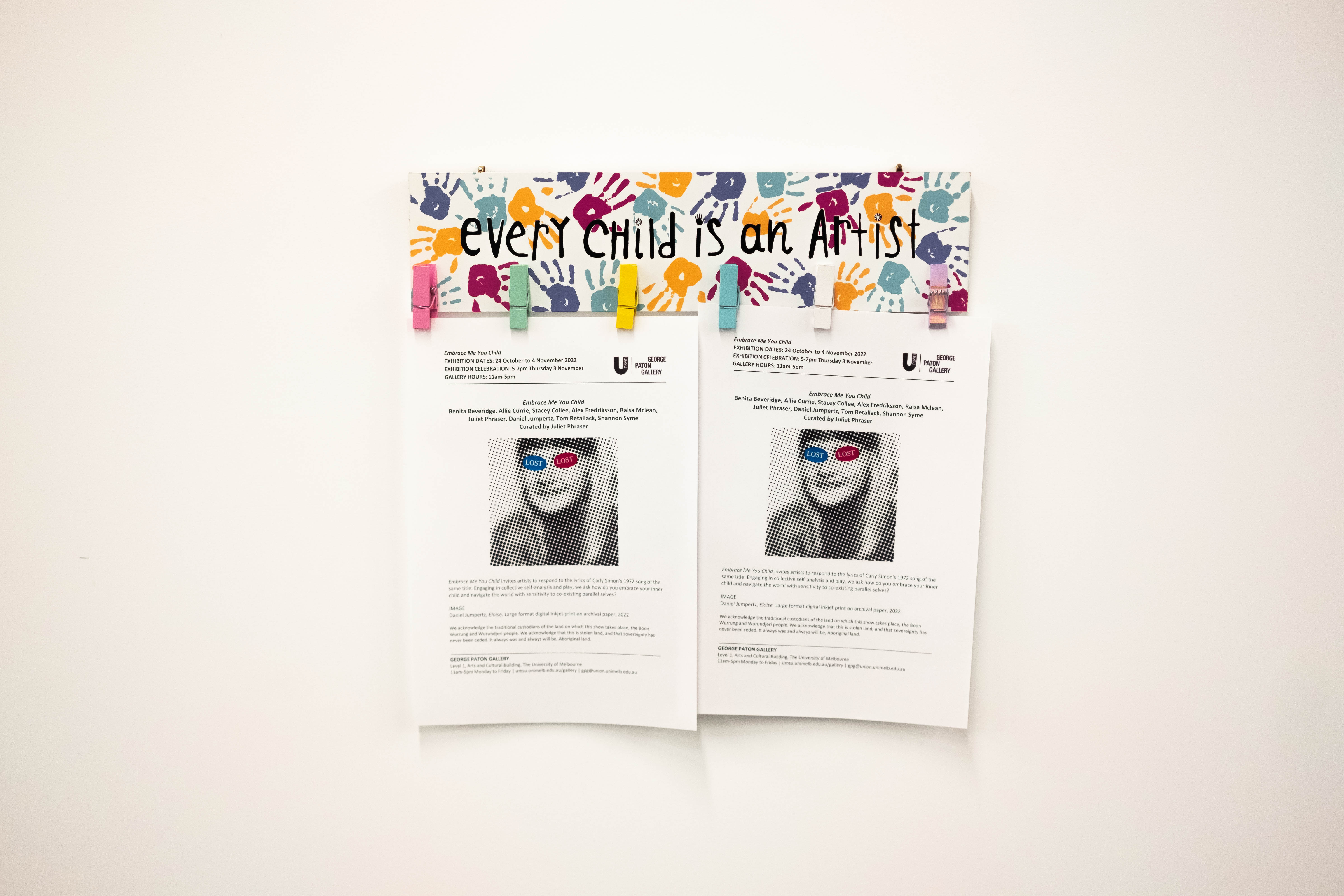 Embrace Me You Child included the work of Benita Beveridge, Allie Currie, Stacey Collee, Alex Fredriksson, Raisa Mclean, Juliet Phraser, Daniel Jumpertz, Tom Retallack and Shannon Syme. Curated by Juliet Phraser for the George Paton Gallery.