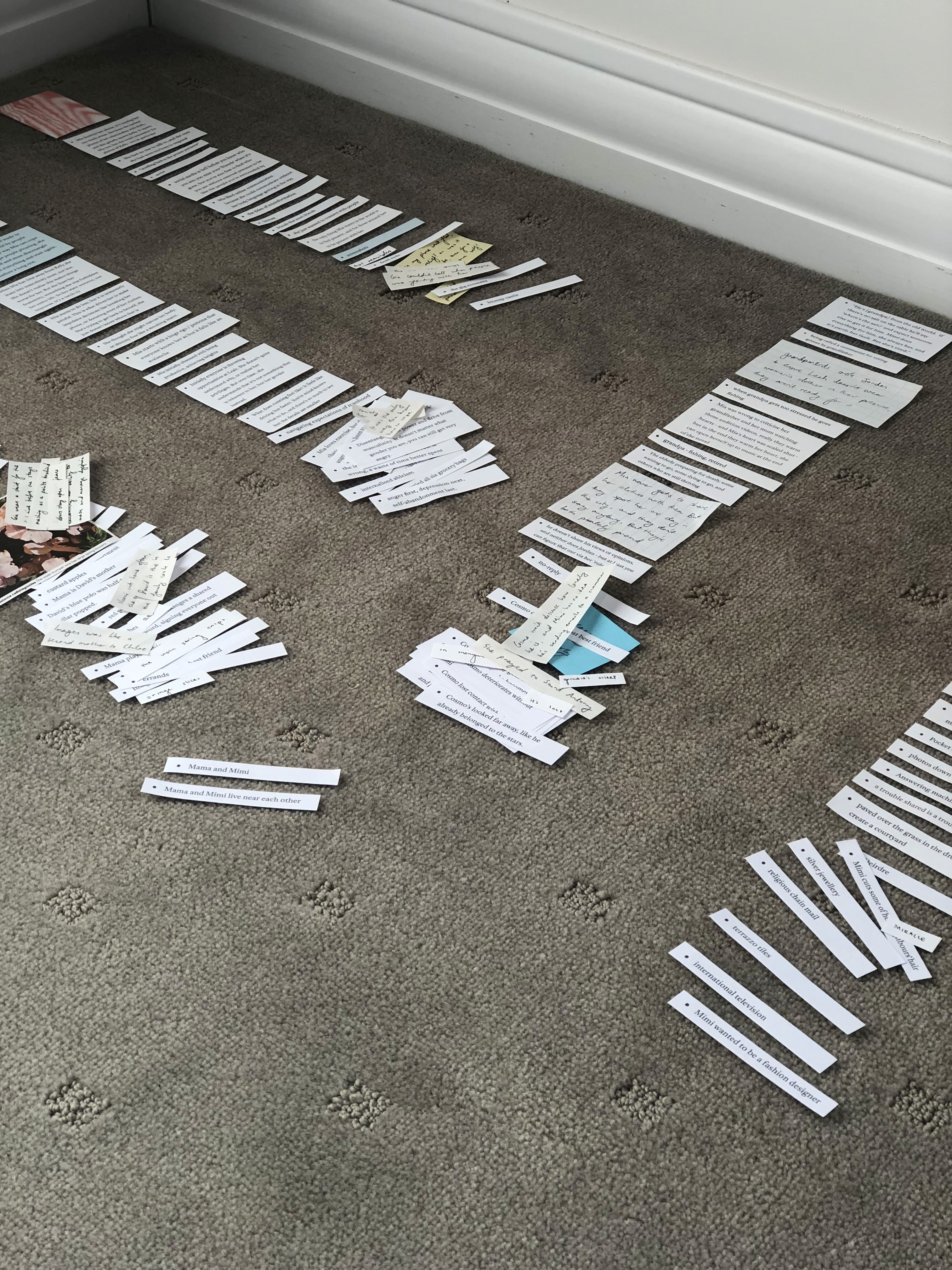 Paraphernalia, notes and other materials were collected and distributed into piles every few months. Here is the final and largest batch of collected materials, from mid-2022, strewn across my bedroom carpet. The narrow strips of paper came from bullet point lists of ideas that were originally text messages I sent myself. Texting myself became my primary method of recording and organising ideas on the go.