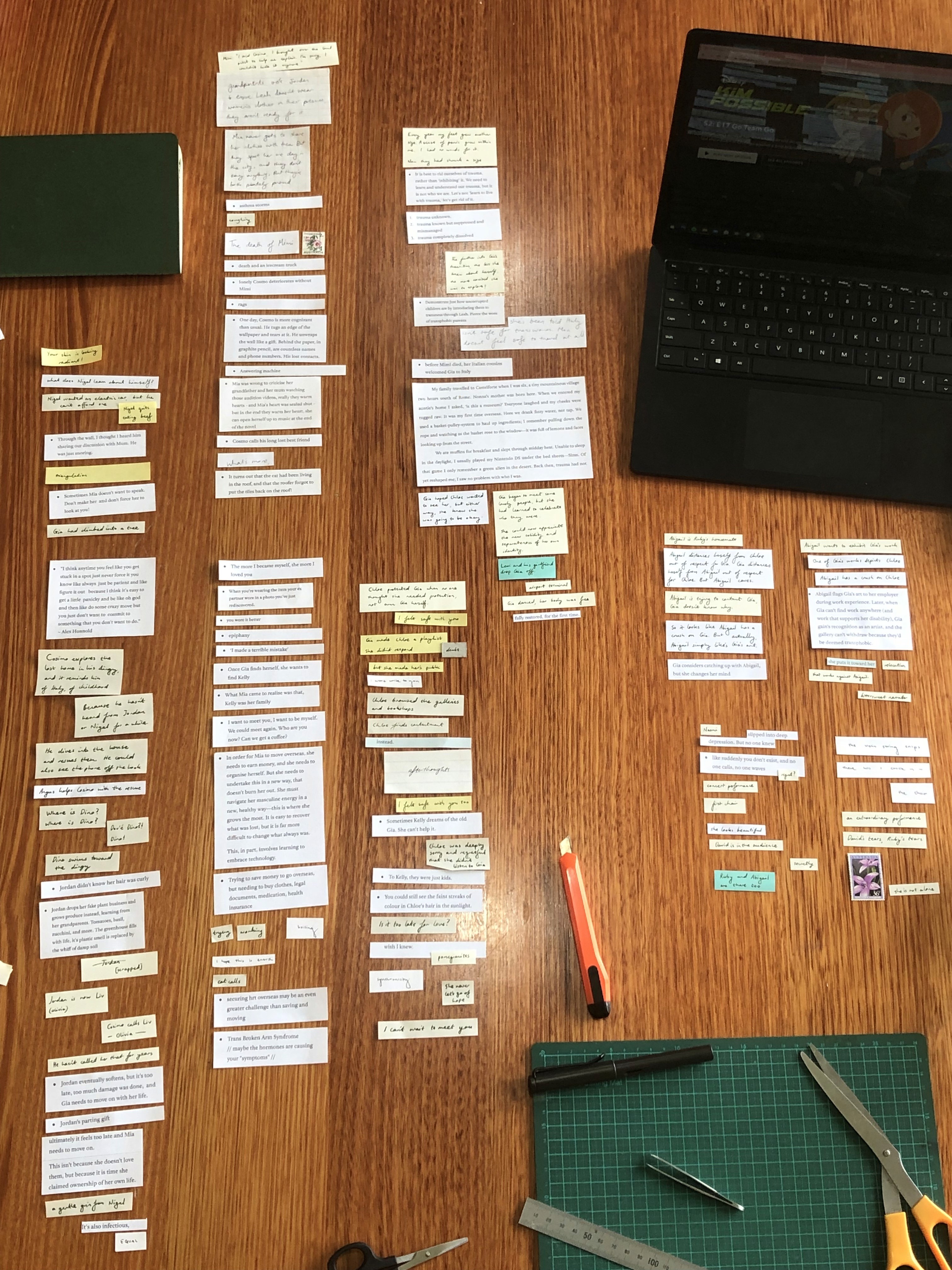 Everything Before Gia was my second attempt at writing a novel. The first attempt, in 2020, taught me that I needed time to arrive at the world of my story organically, rather than forcing plot or character development inside the pages of a notebook. For my second attempt (2021) I drew inspiration from my time at the VCA to test a different approach: collaging with scissors and tape. This practice began with eighteen months left studying my Bachelor of Arts. Upon my graduation I'd produced 624 pages of material across seven scrapbooks.