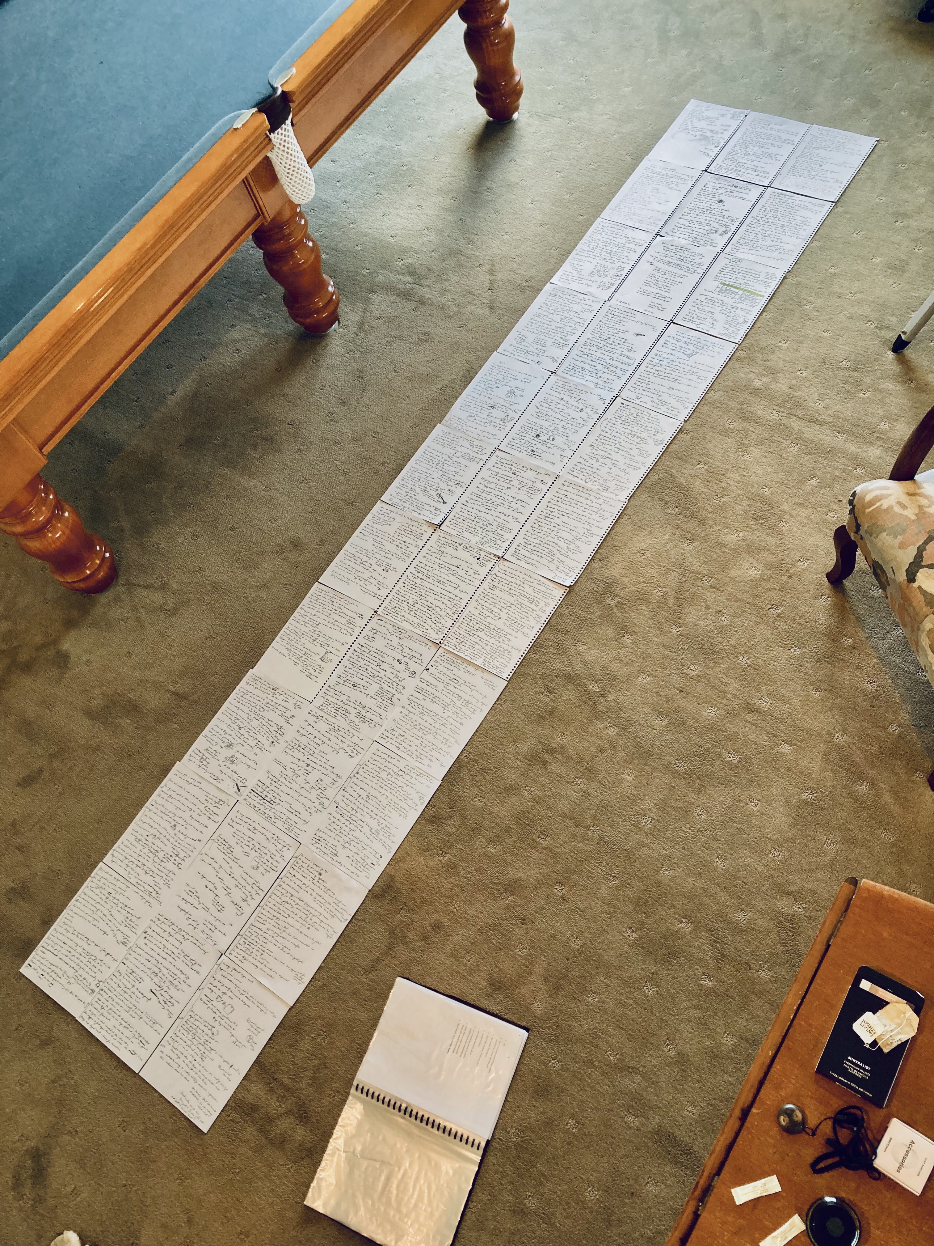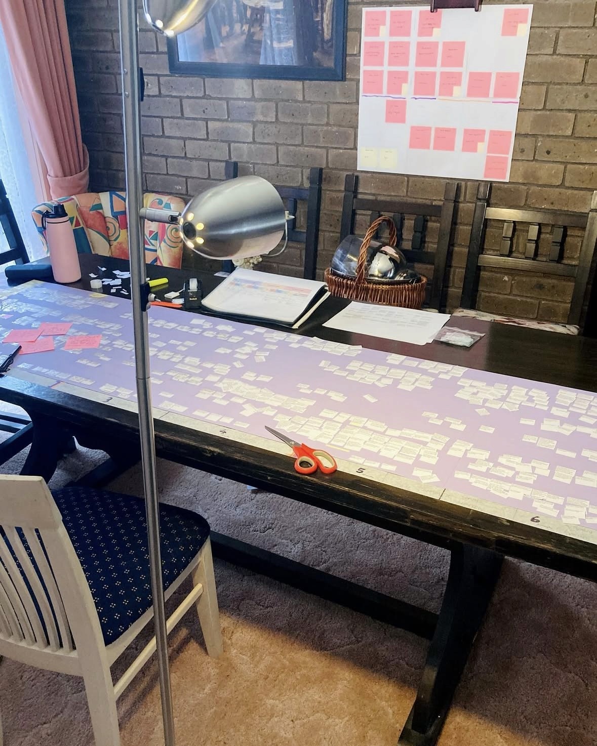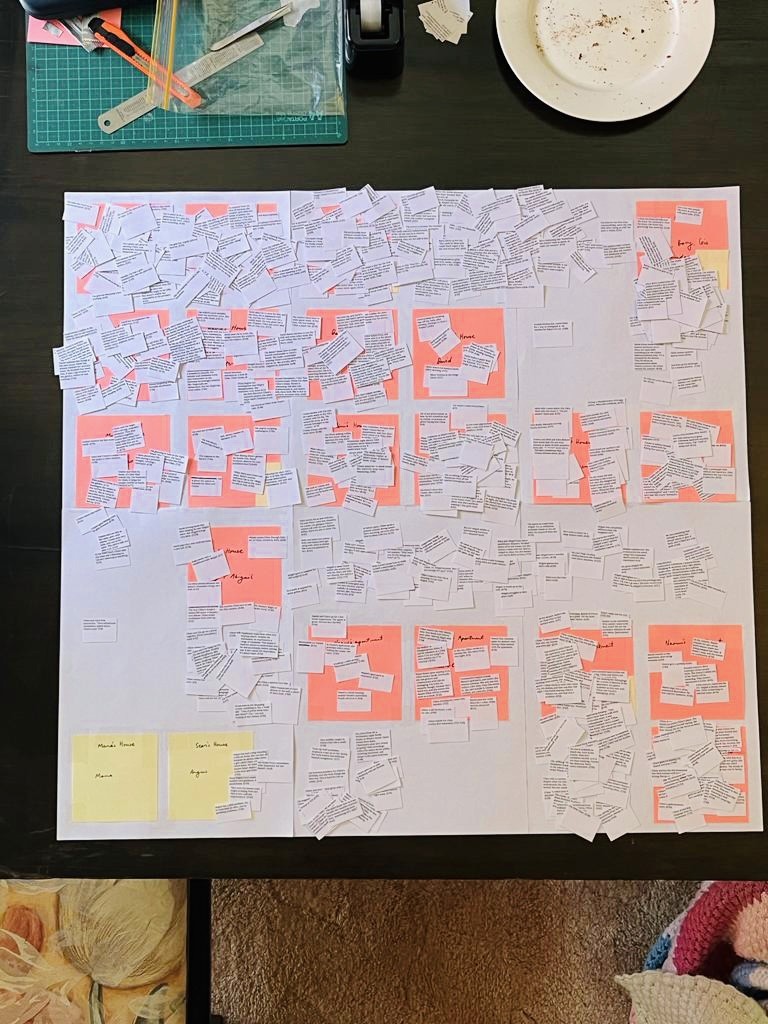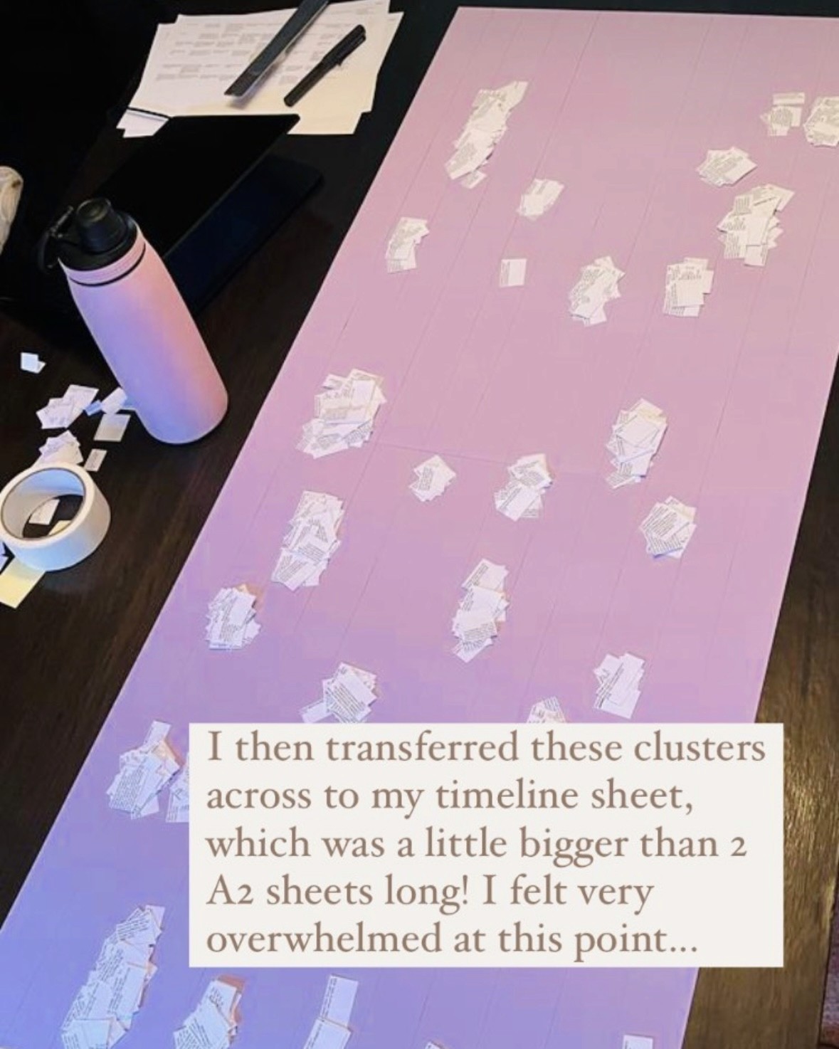I finished this timeline in early 2023, proving to myself that, on a technical level, it was possible to write this story. Every note includes a reference to the specific scrapbook and page they are derived from. What seems like an extreme process(!) was simply the natural progression of my collaging approach to idea generation. When you piece two ideas together, you end up with three. A page becomes a scene; a timeline, a novel.