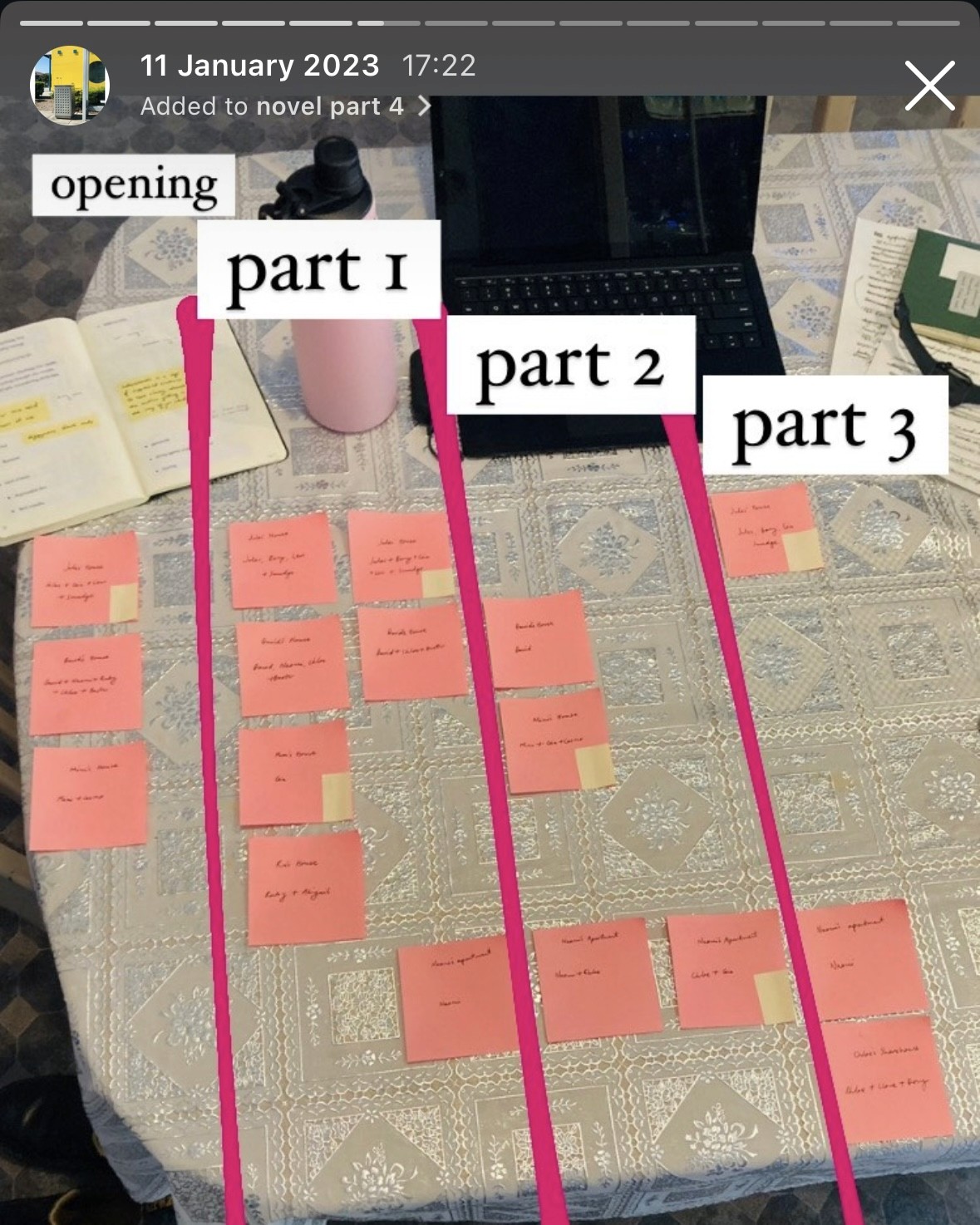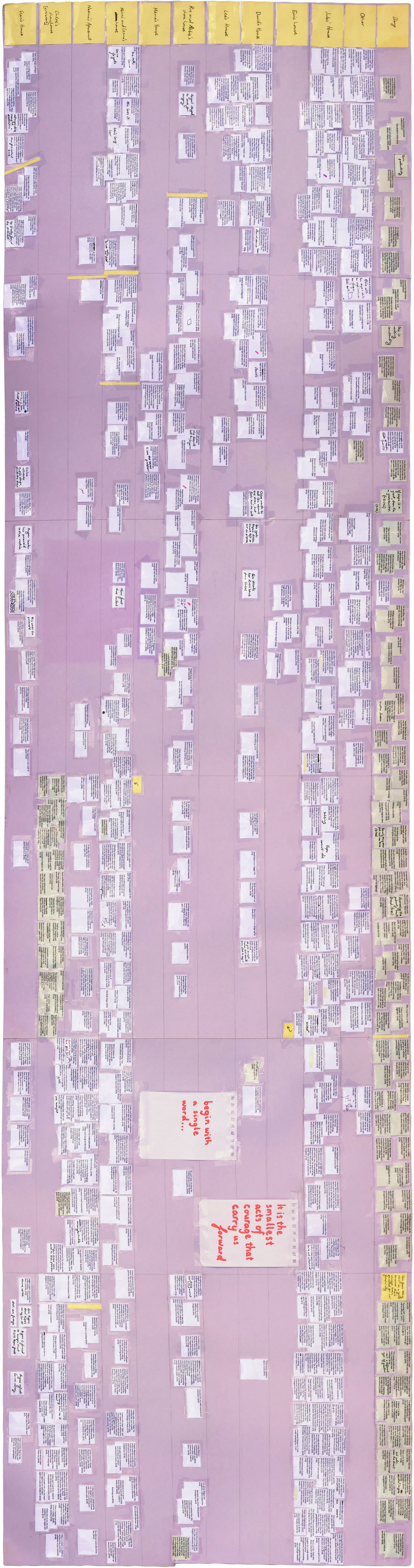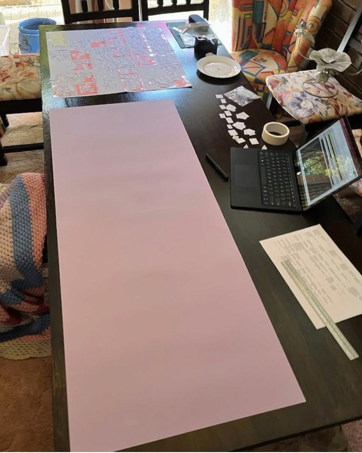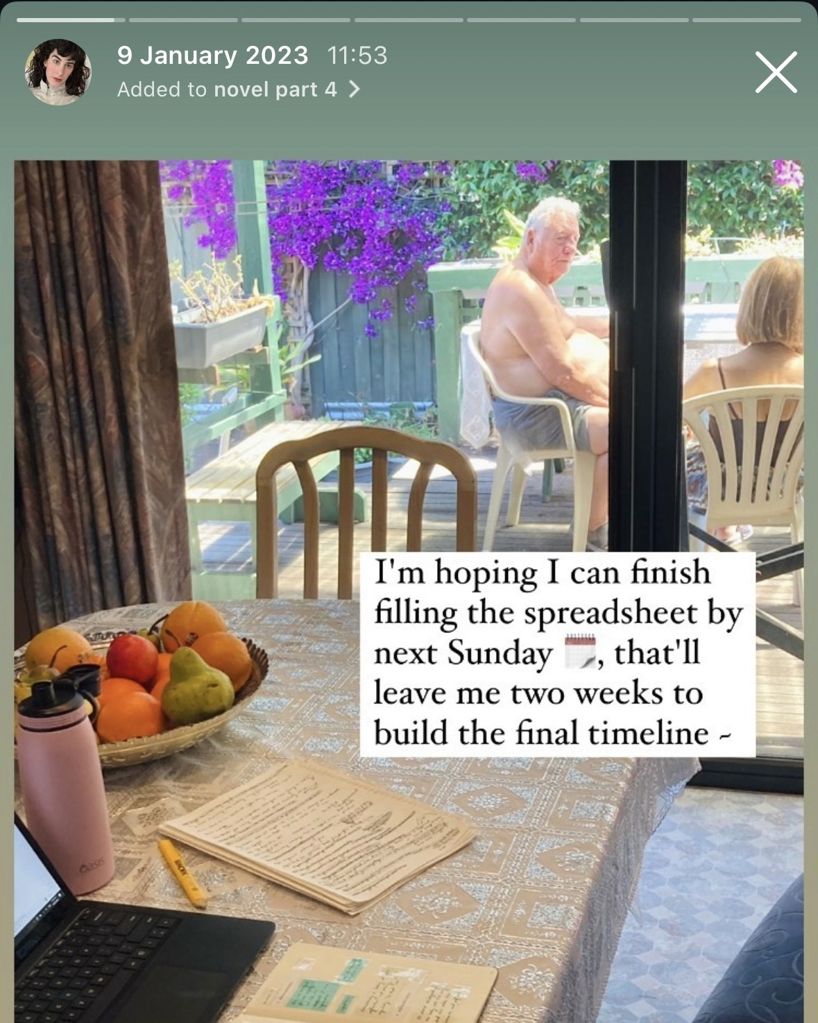 I finished this timeline in early 2023, proving to myself that, on a technical level, it was possible to write this story. Every note includes a reference to the specific scrapbook and page they are derived from. What seems like an extreme process(!) was simply the natural progression of my collaging approach to idea generation. When you piece two ideas together, you end up with three. A page becomes a scene; a timeline, a novel.