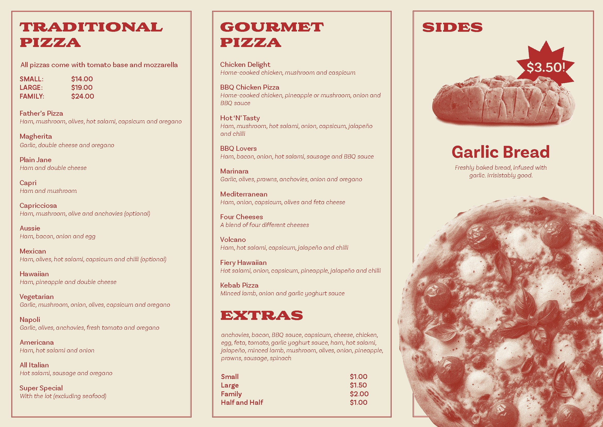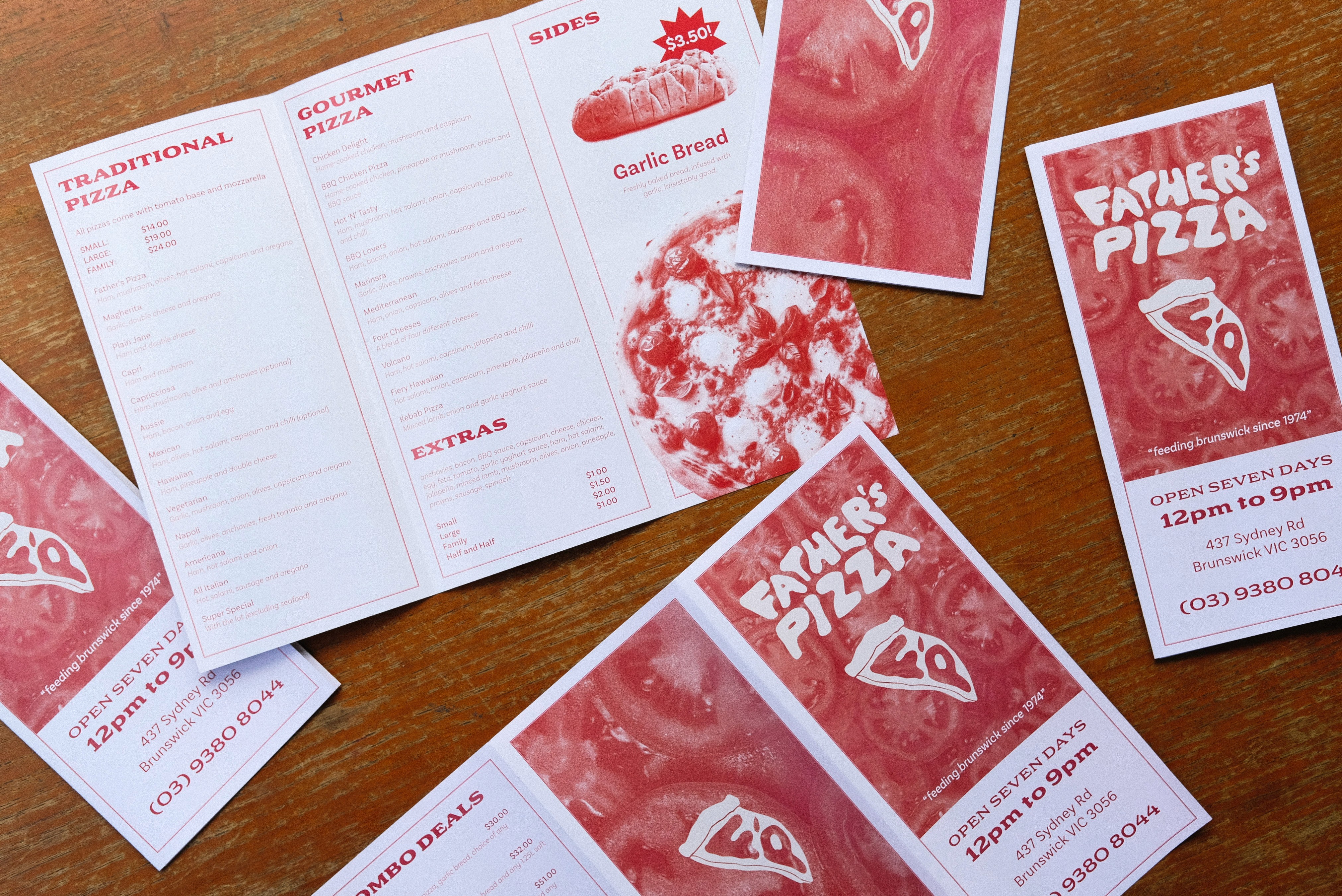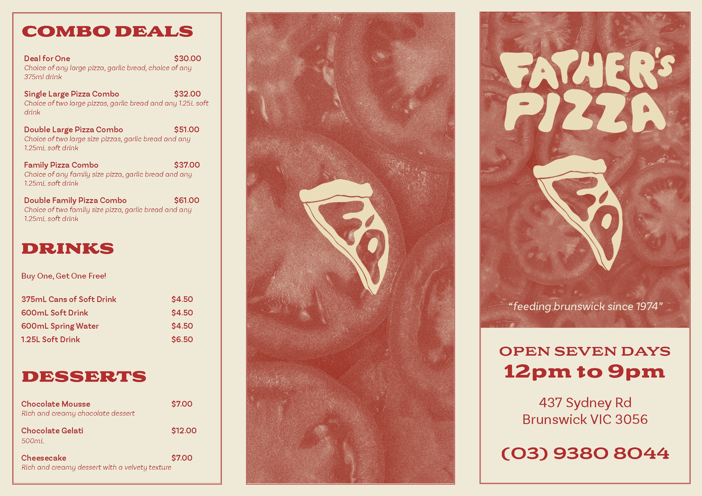 As part of my Diploma of Graphic Design I was tasked with rebranding a Sydney Road business. This work was for educational purposes only. As a predominately takeaway pizza restaurant, I tailored this menu design to the business' needs and drew inspiration from their pre-existing branding, such as their vintage backlit menu display.