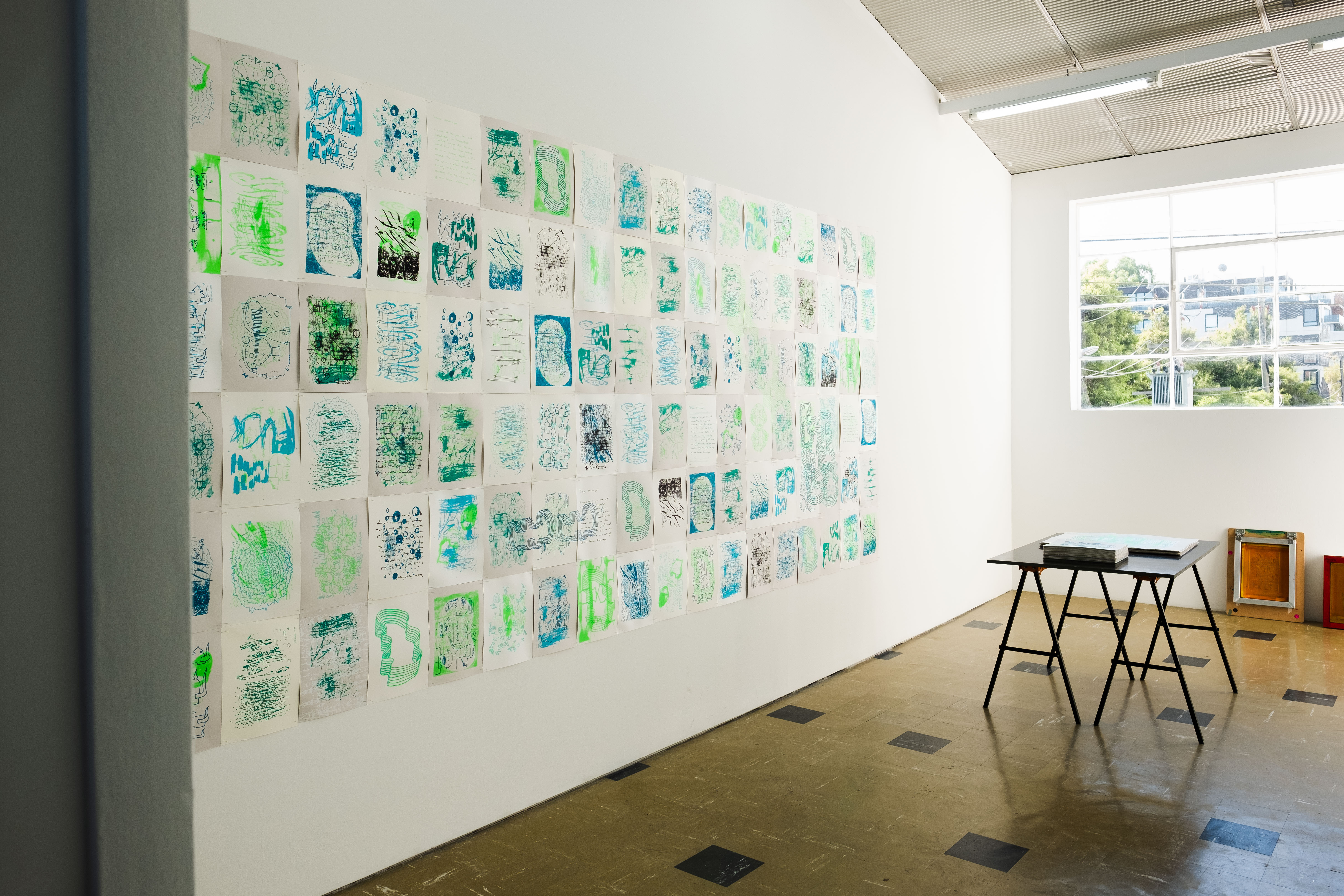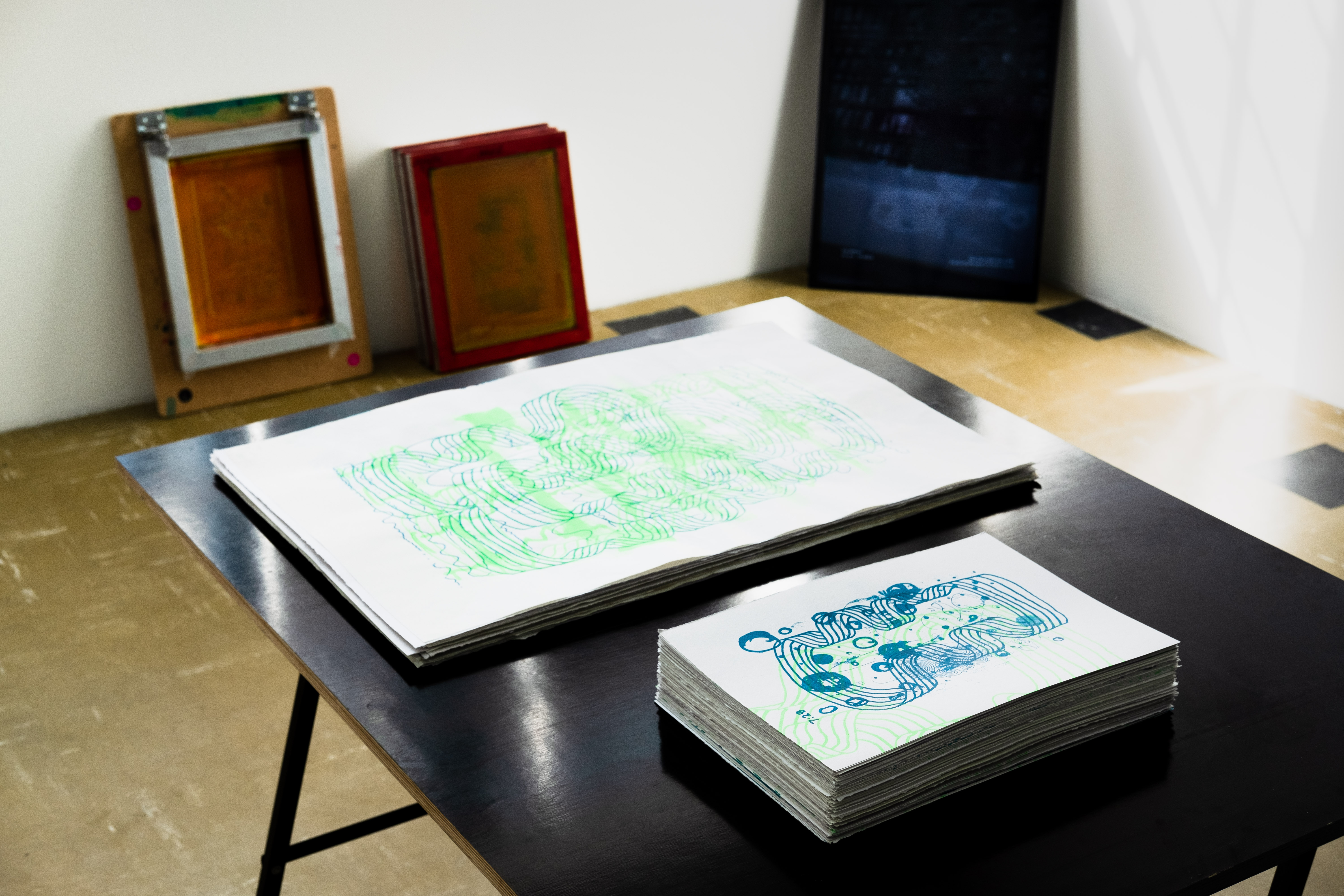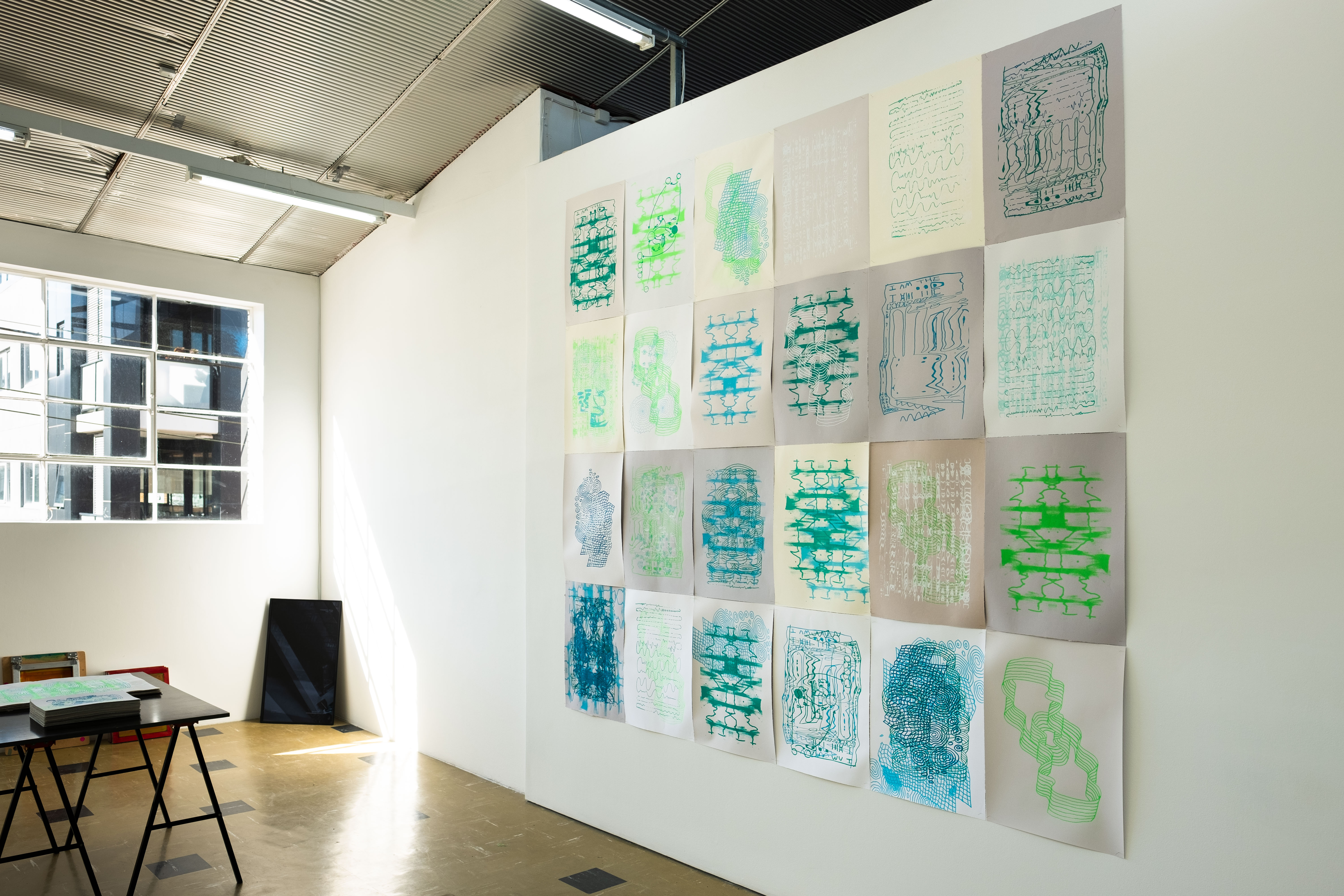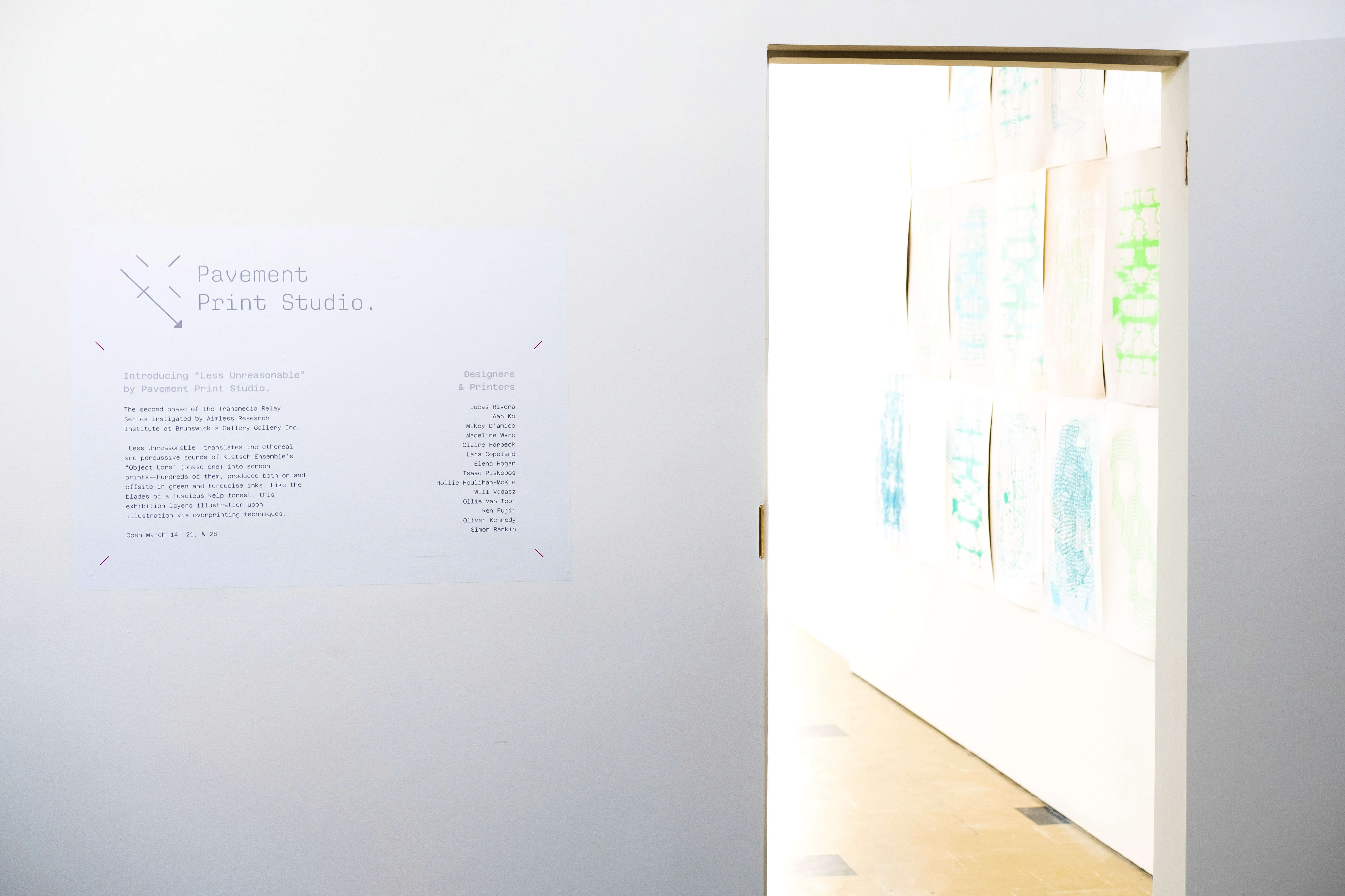 "Less Unreasonable" translates the ethereal and percussive sounds of Klatsch Ensemble's "Object Lore" (phase one) into screen prints—hundreds of them, produced both on and offsite in green and turquoise inks. Like the blades of luscious kelp forest, this exhibition layers illustration upon illustration via overprinting techniques.