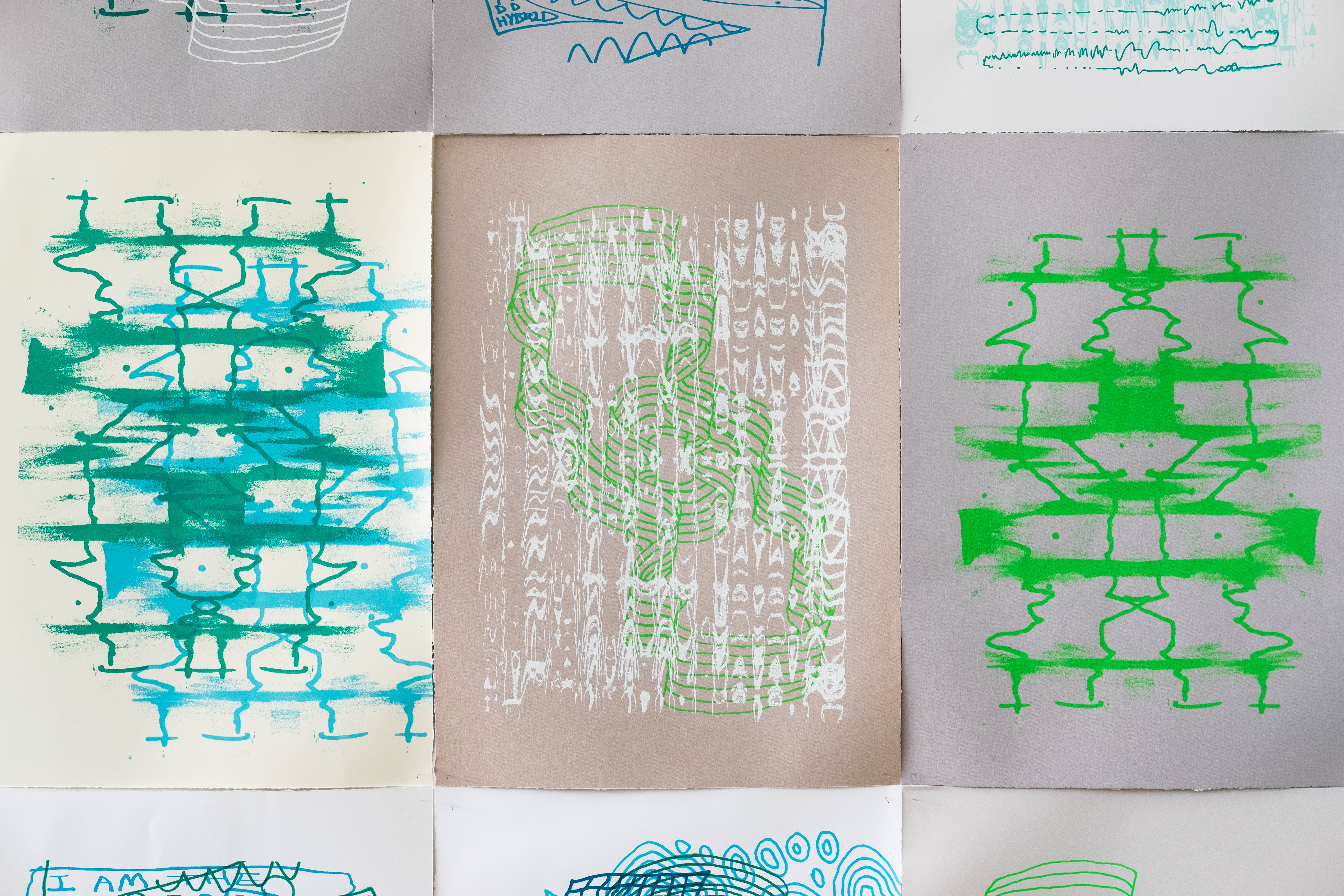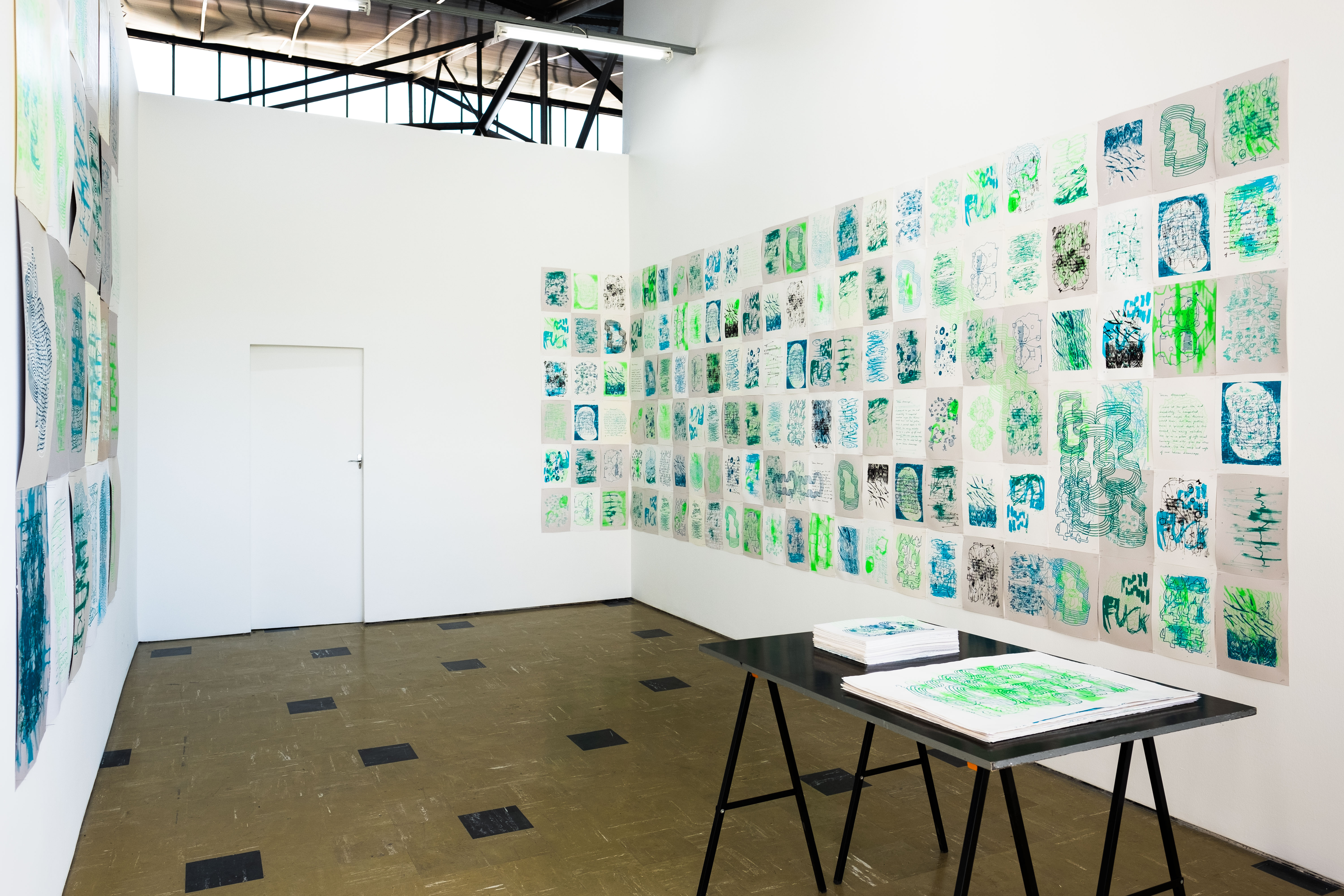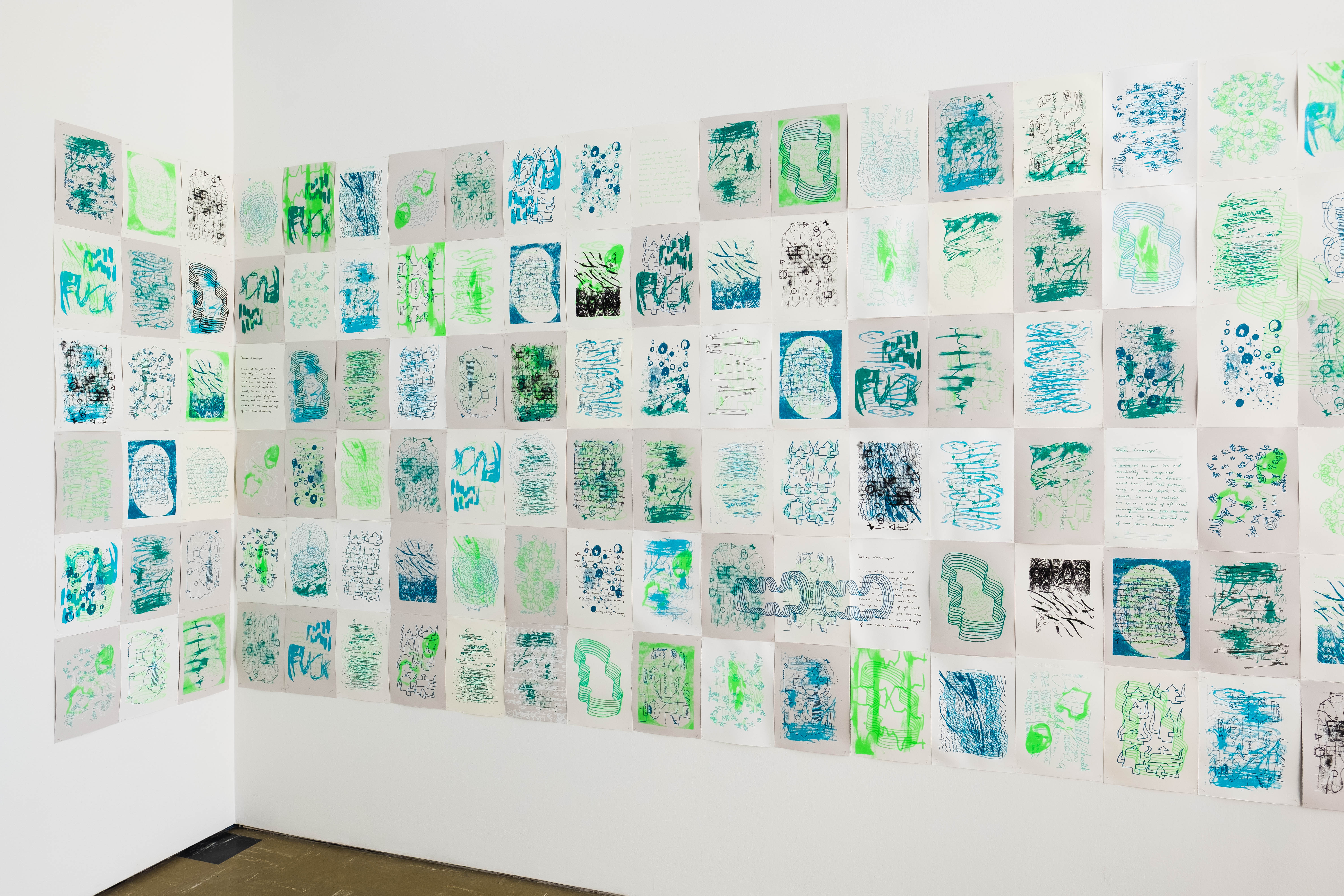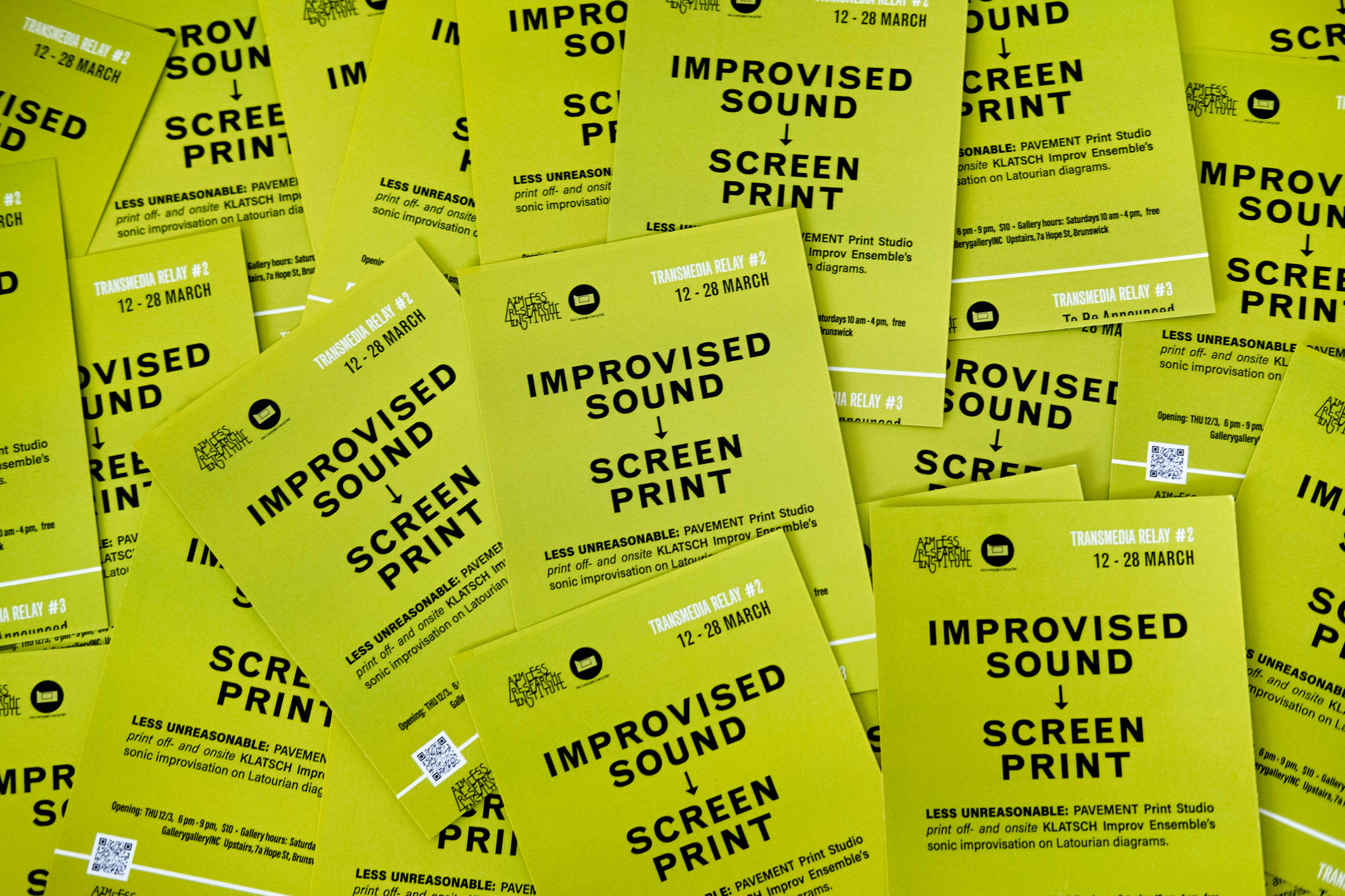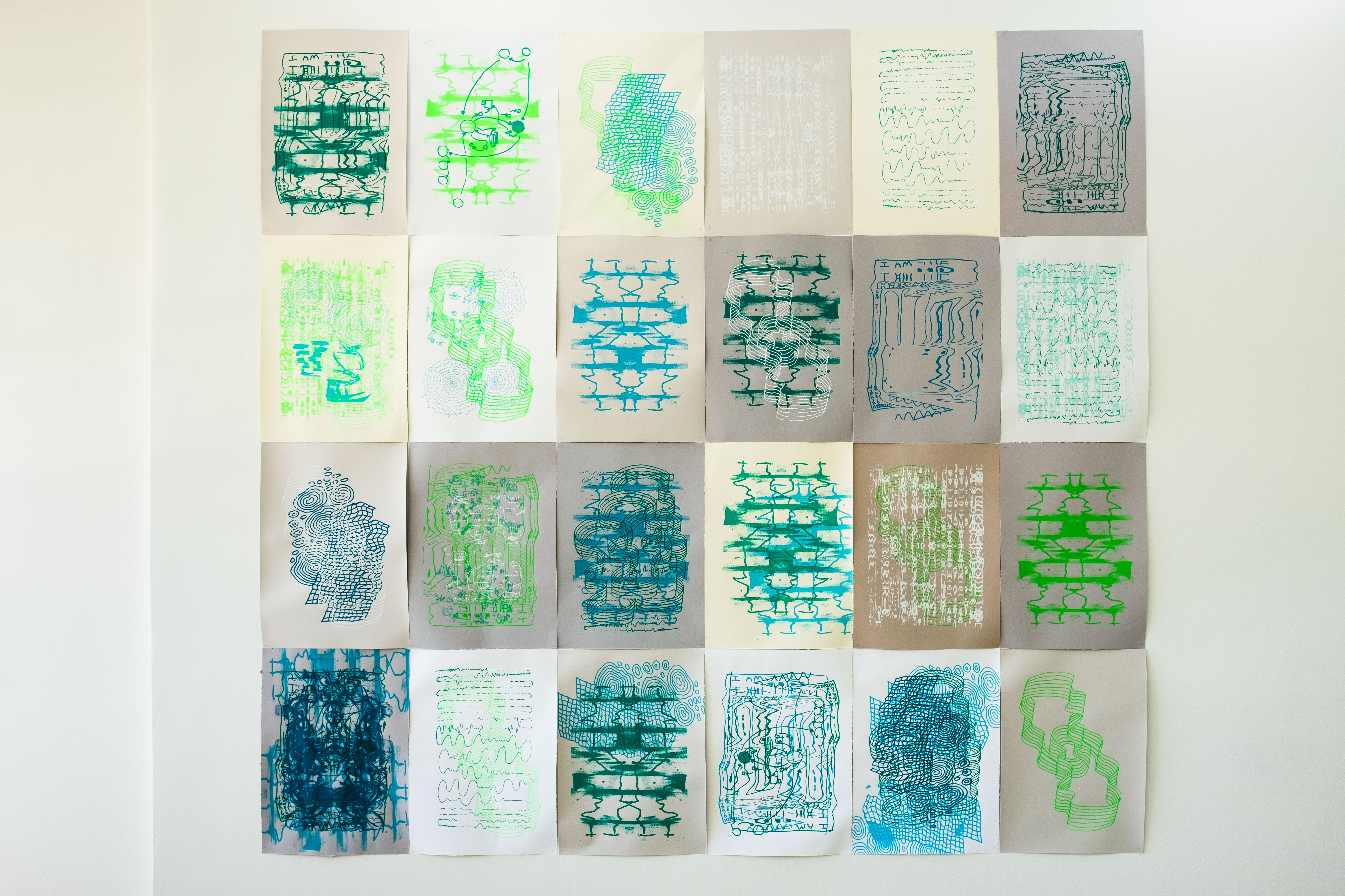 "Less Unreasonable" translates the ethereal and percussive sounds of Klatsch Ensemble's "Object Lore" (phase one) into screen prints—hundreds of them, produced both on and offsite in green and turquoise inks. Like the blades of luscious kelp forest, this exhibition layers illustration upon illustration via overprinting techniques.