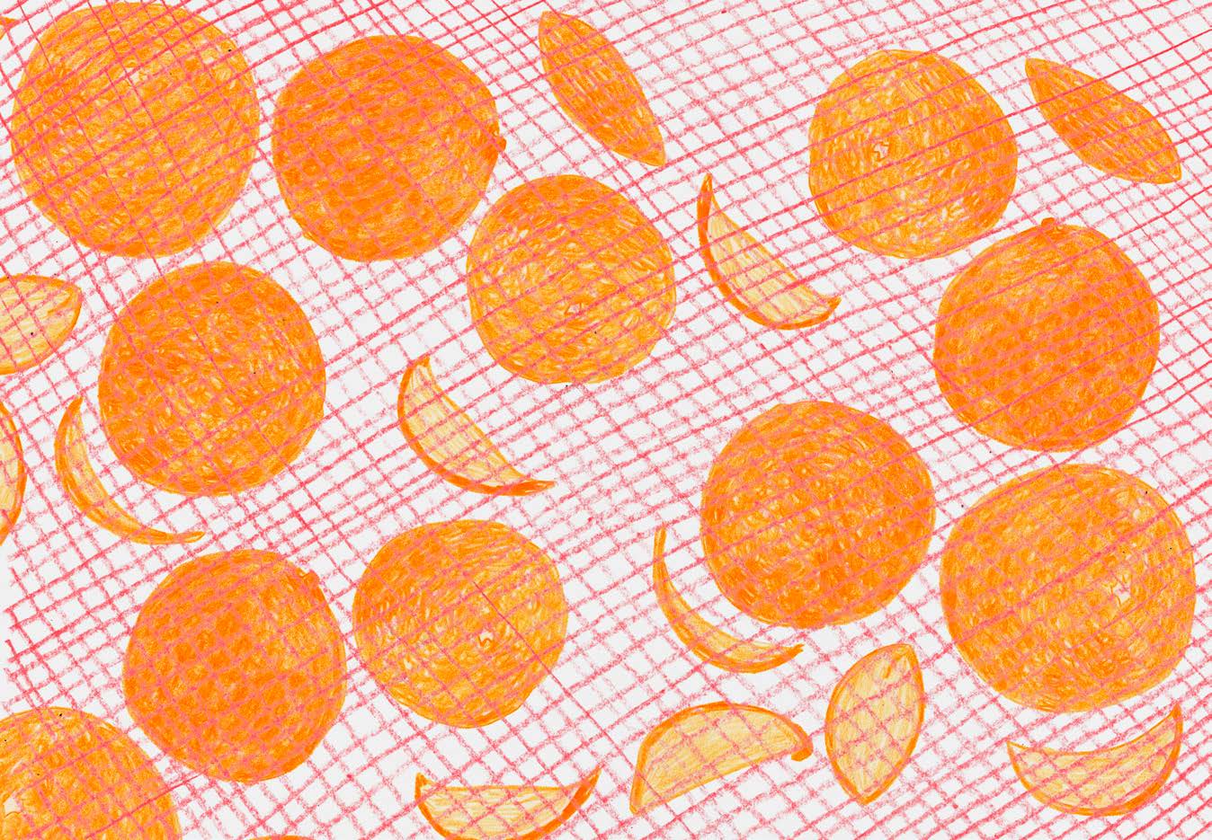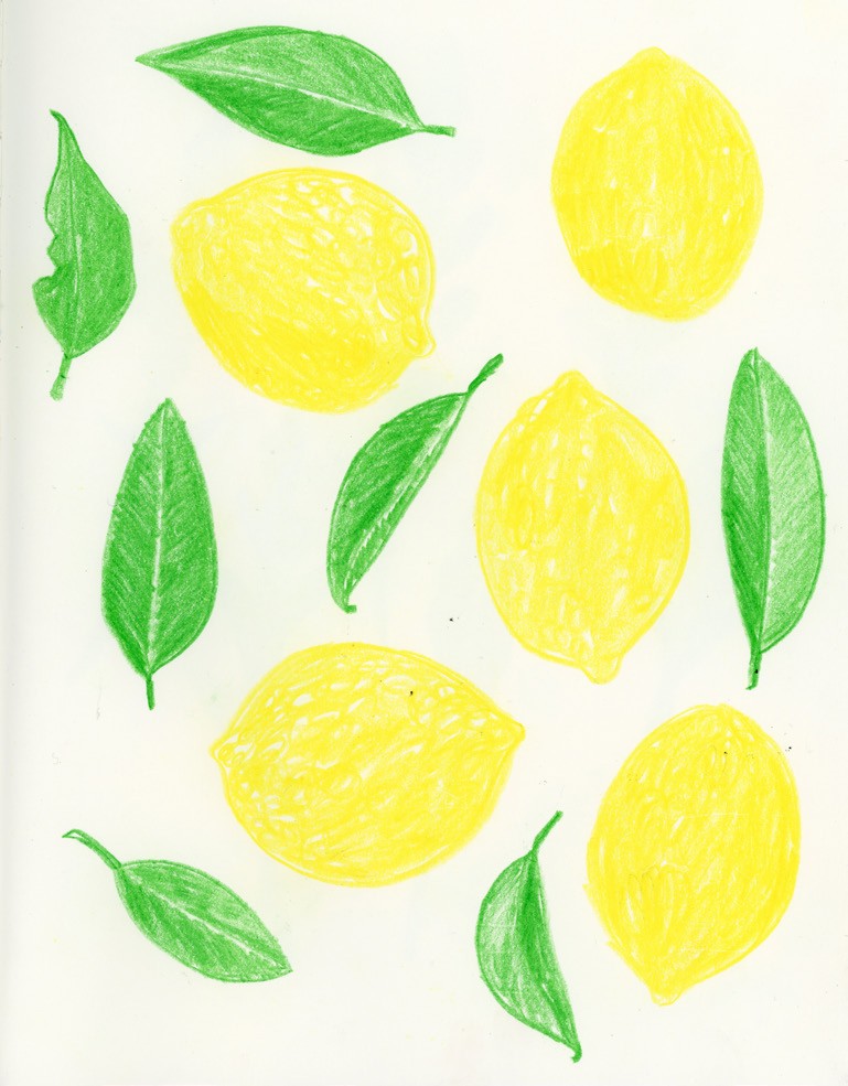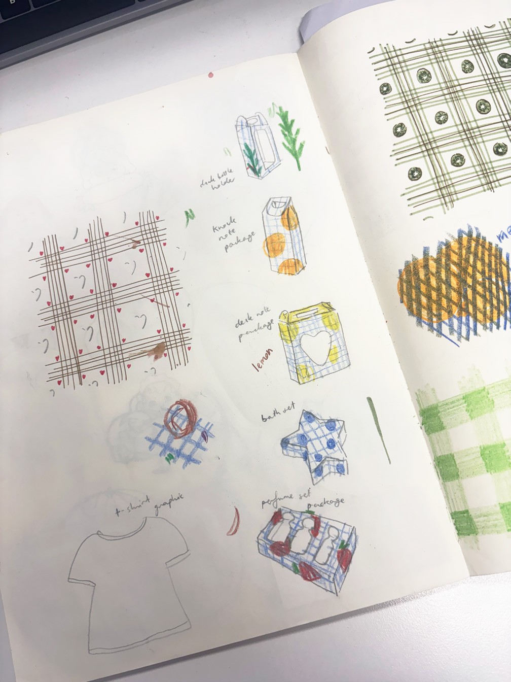 I approached my design concept with these empahases in mind, beginning with hand drawm patterns of gingham and a mesh-like cross hatch style. These patterns are meant to reflect a picnic blanket and fruit bags respectively (see my Knock Note design for a bag of oranges). I then incorporated pencil illustrations of fruit using Adobe photoshop, adjusting the hues of the background patterns according to visual harmony.