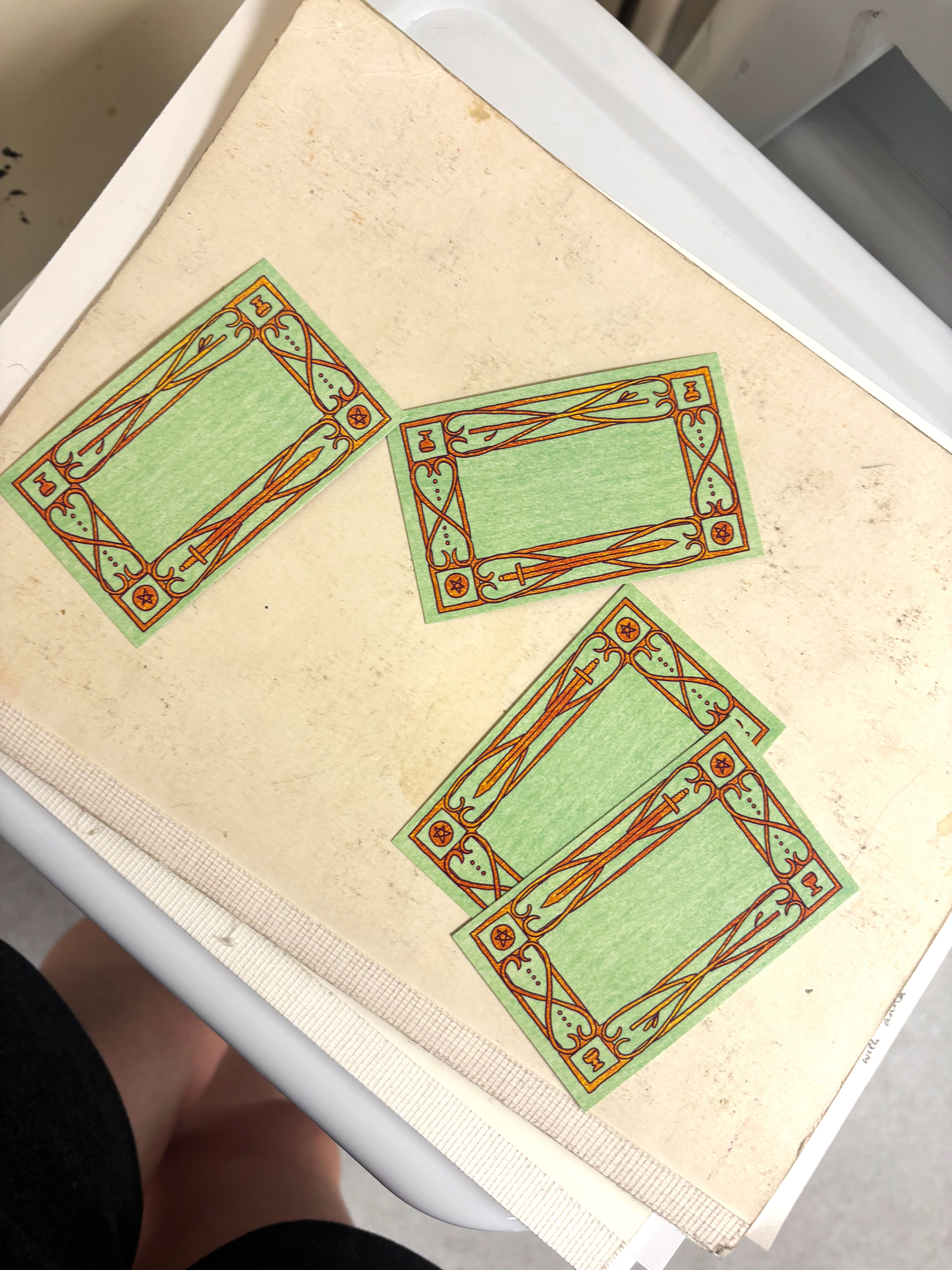 Early print trial, featuring the custom frame with an inlaid faux gold foiling.